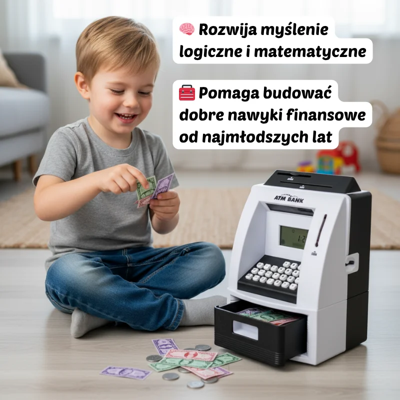 Oczywiście! Posiada wbudowany kalkulator, zegar i możliwość ustawienia celu oszczędności. Dziecko rozwija logiczne myślenie, uczy się liczenia i planowania wydatków.