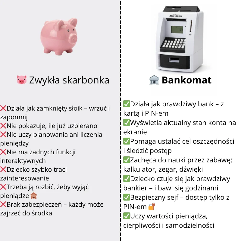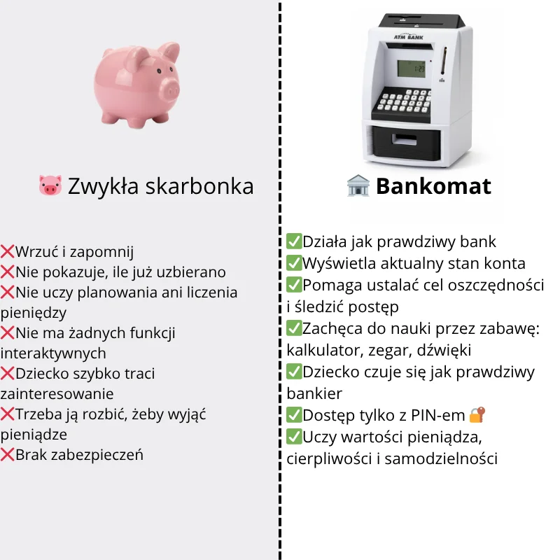 Zdecydowanie tak! Skarbonka łączy zabawę z nauką – to prezent, który bawi, uczy i inspiruje do oszczędzania. Idealny na święta, urodziny czy Dzień Dziecka.