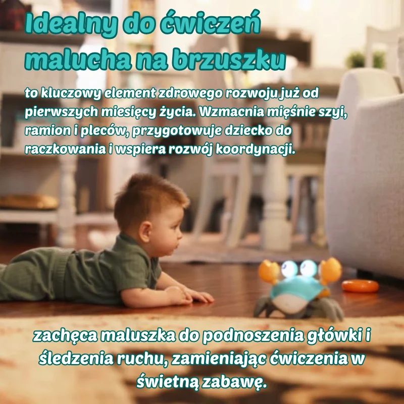 Podczas zabawy krabem dziecko z ciekawością unosi główkę i obserwuje jego ruchy, co wzmacnia mięśnie szyi, ramion i pleców. To idealne wsparcie dla maluchów podczas ćwiczeń „na brzuszku”, które przygotowują do raczkowania.